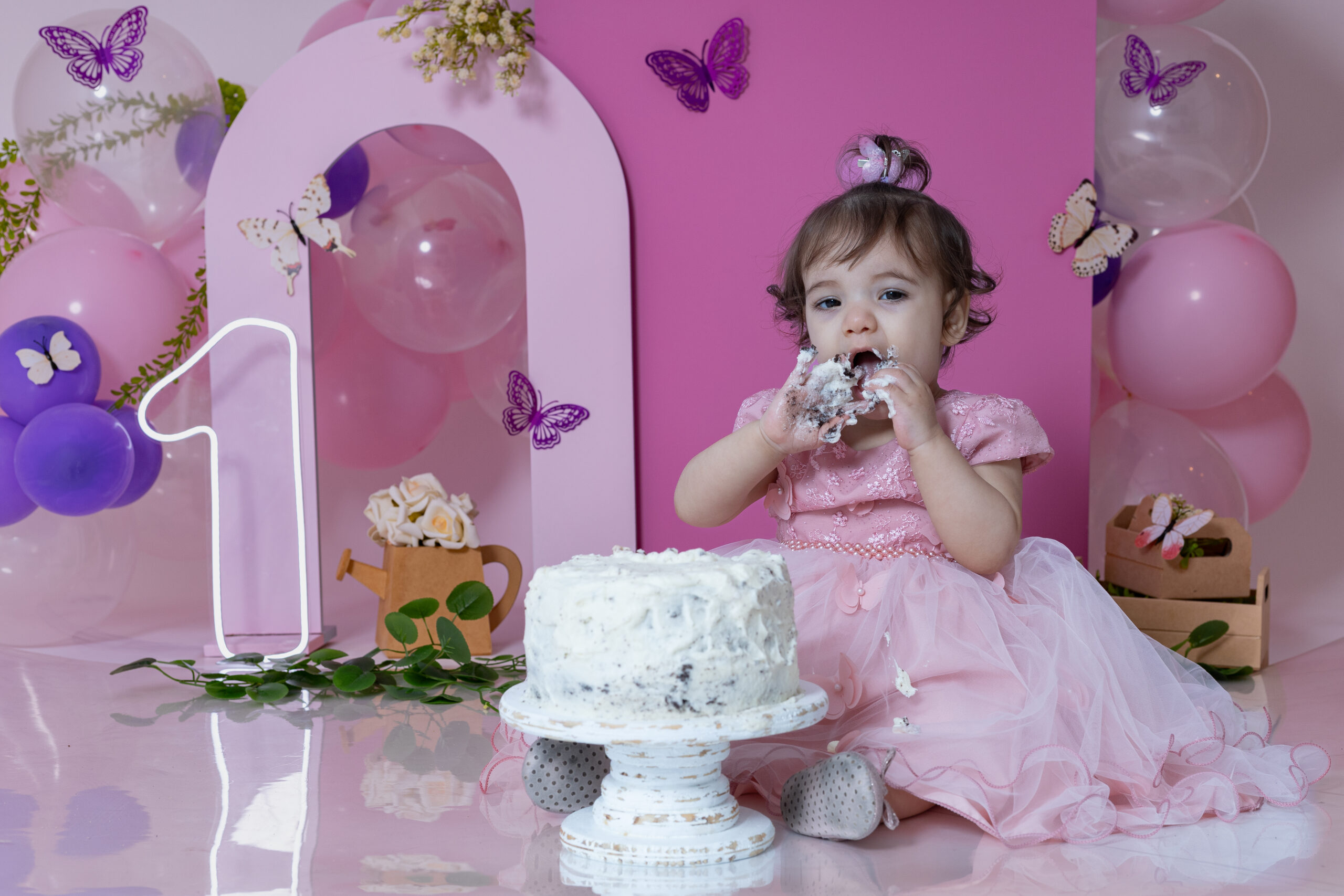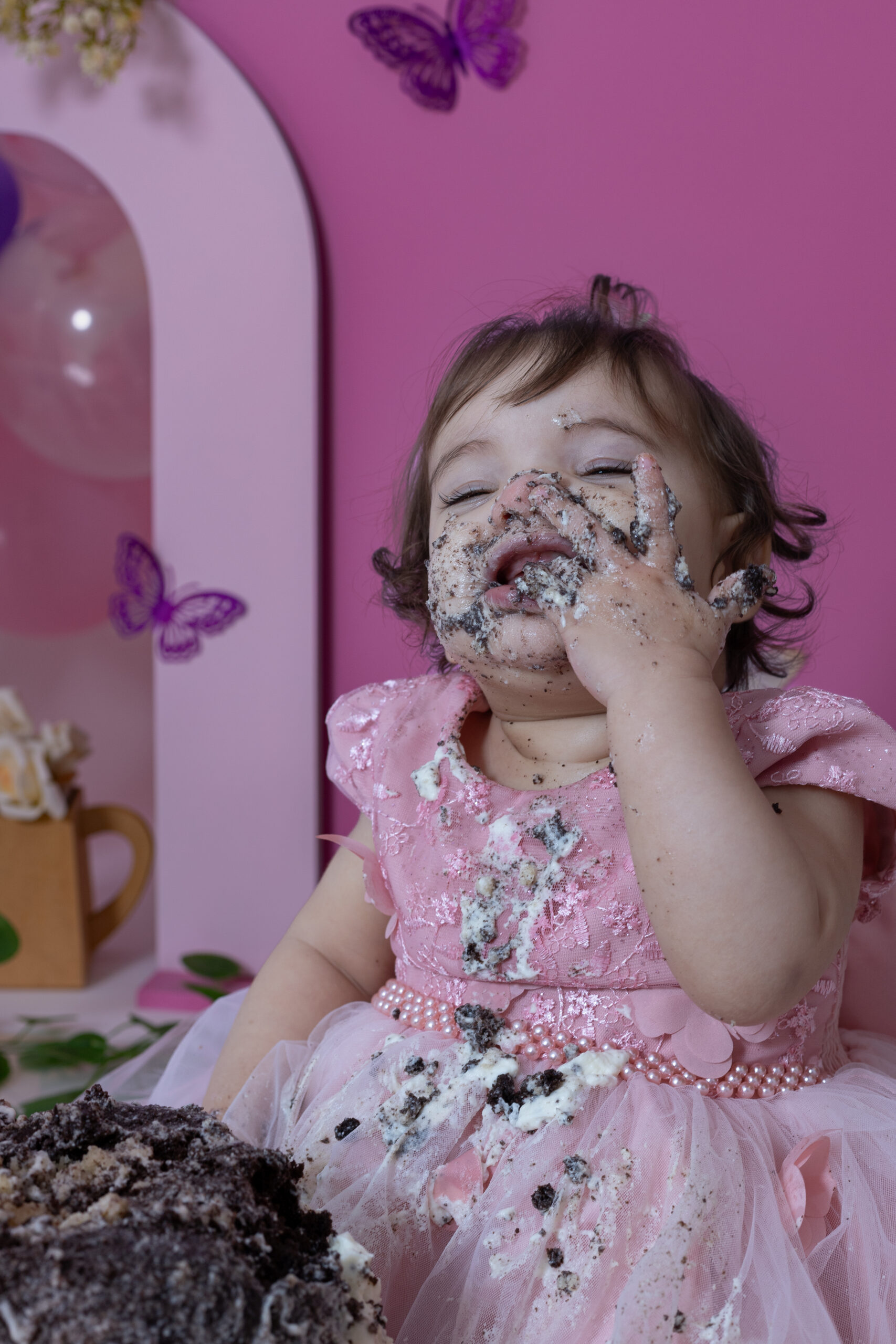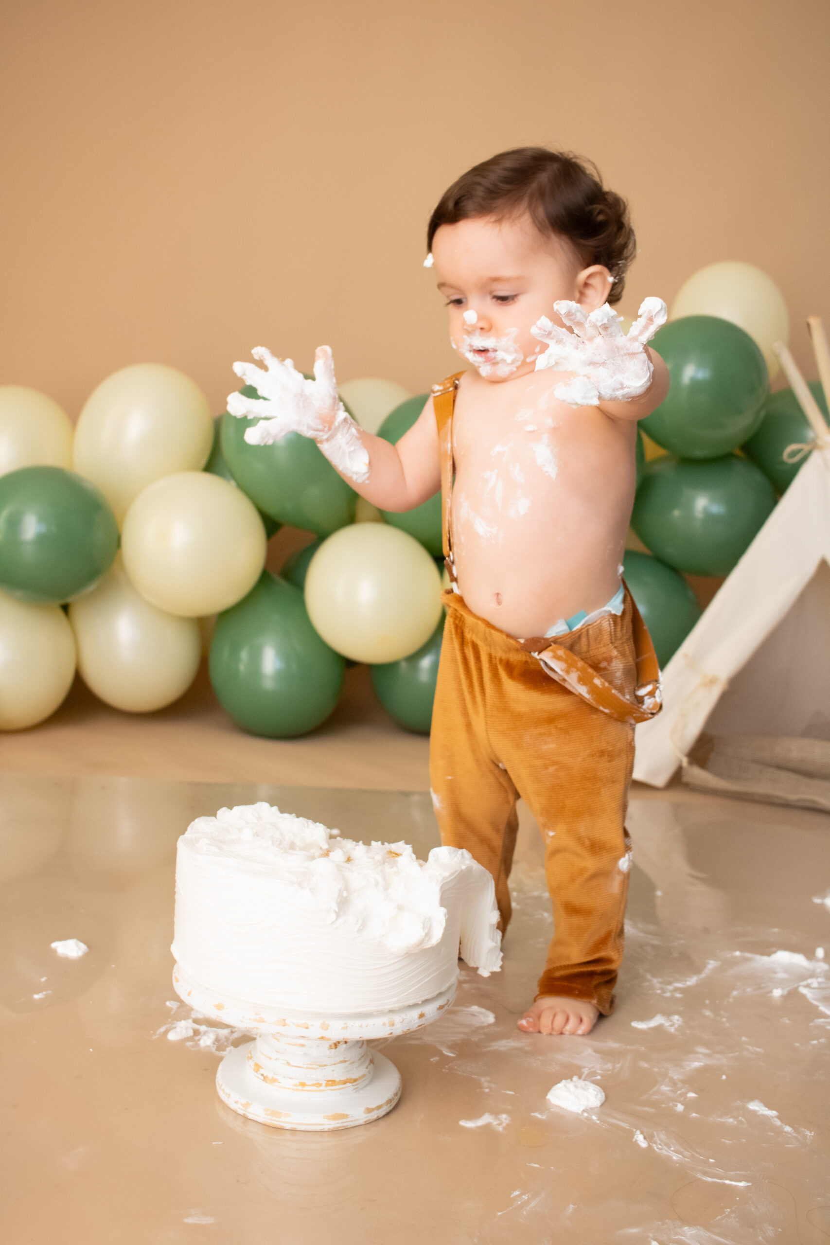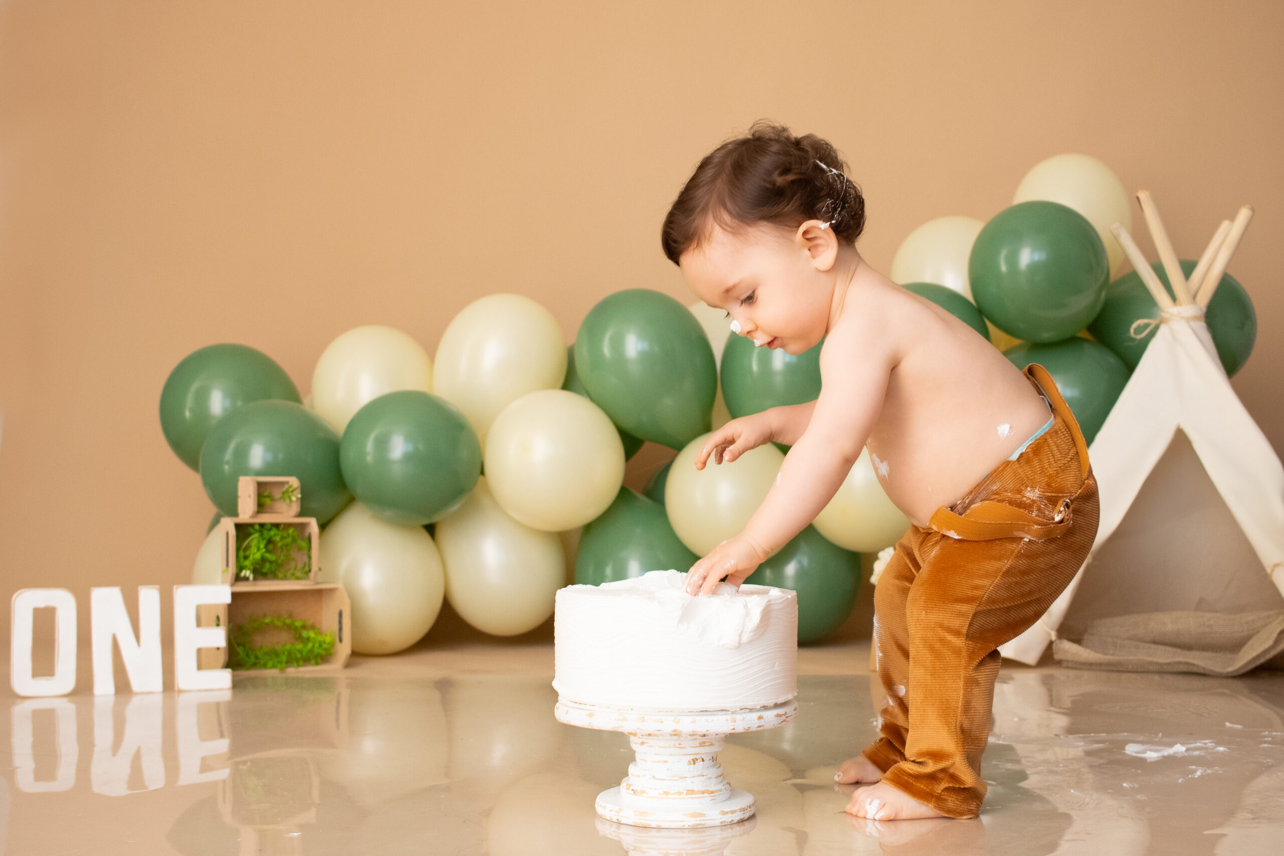 O nome smash the cake, significa ‘’ amassar o bolo’’. Primeiro de tudo tiramos fotos do cenário somente com a decoração, depois colocamos o bebê no centro e apresentamos a ele o bolo para finalmente ele brincar ou até comer o bolo.