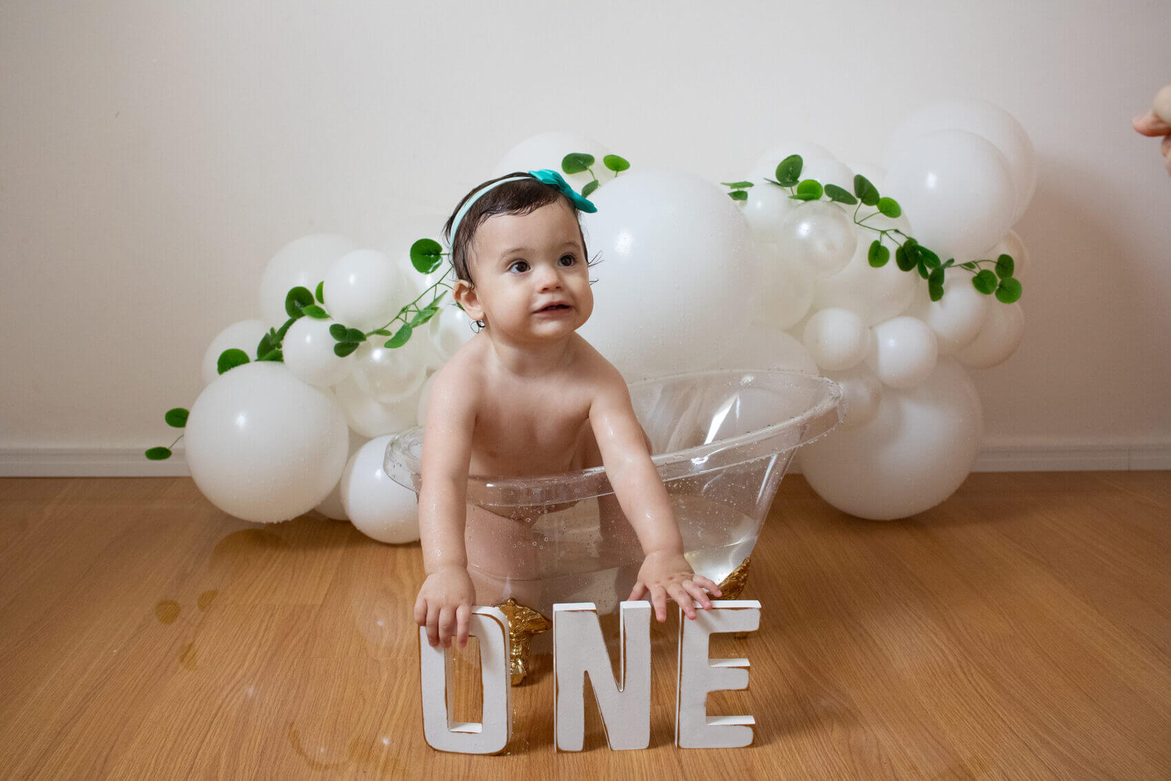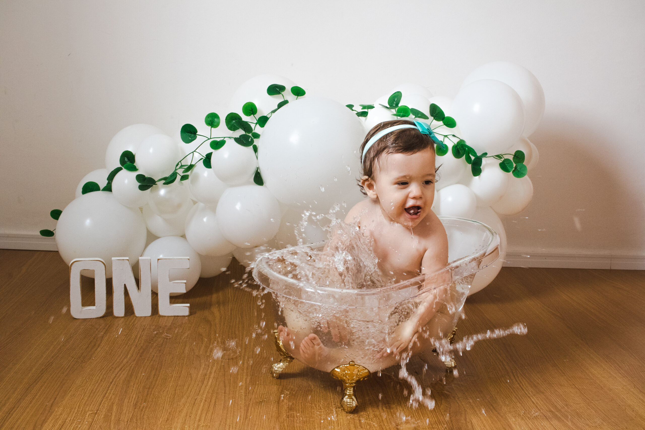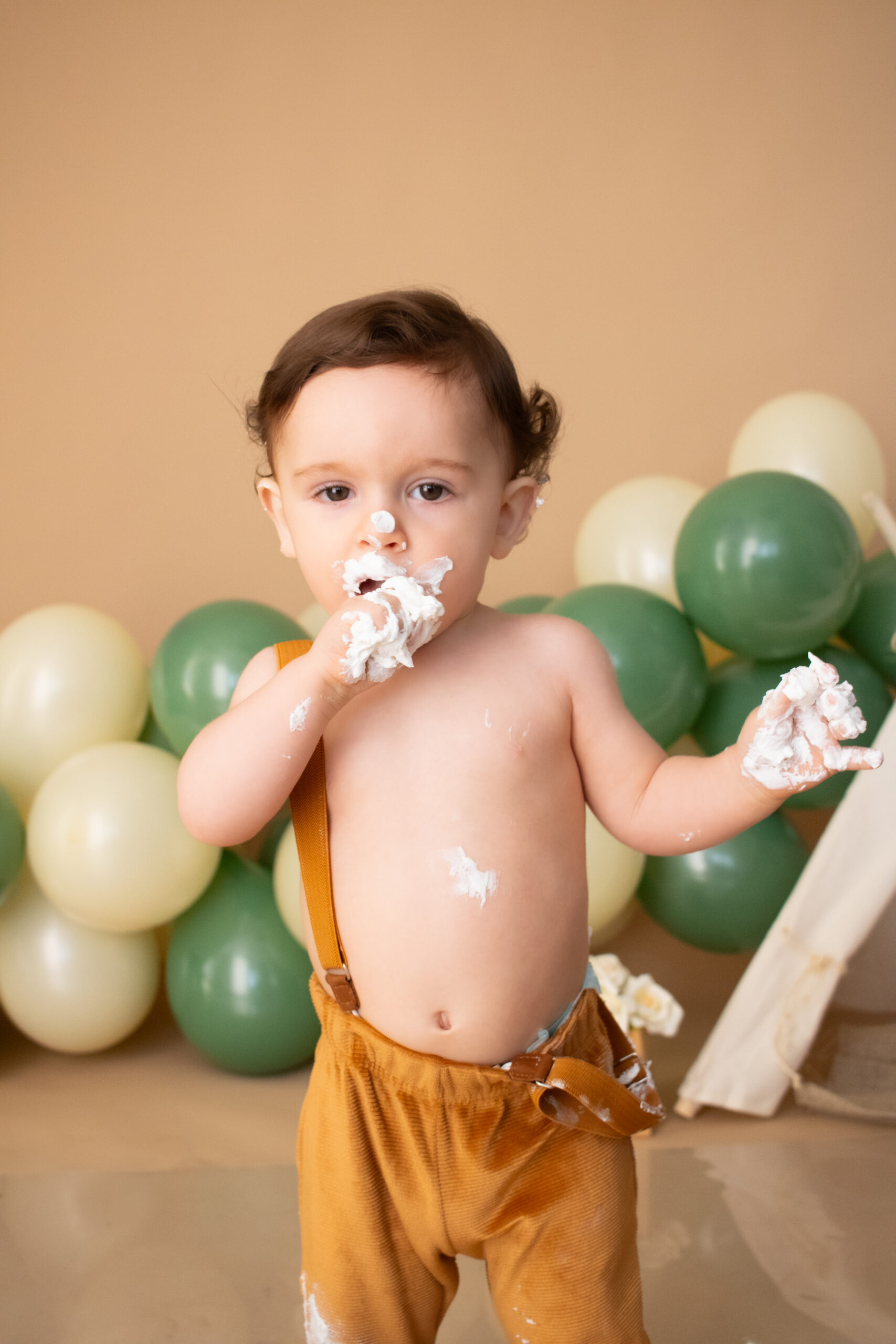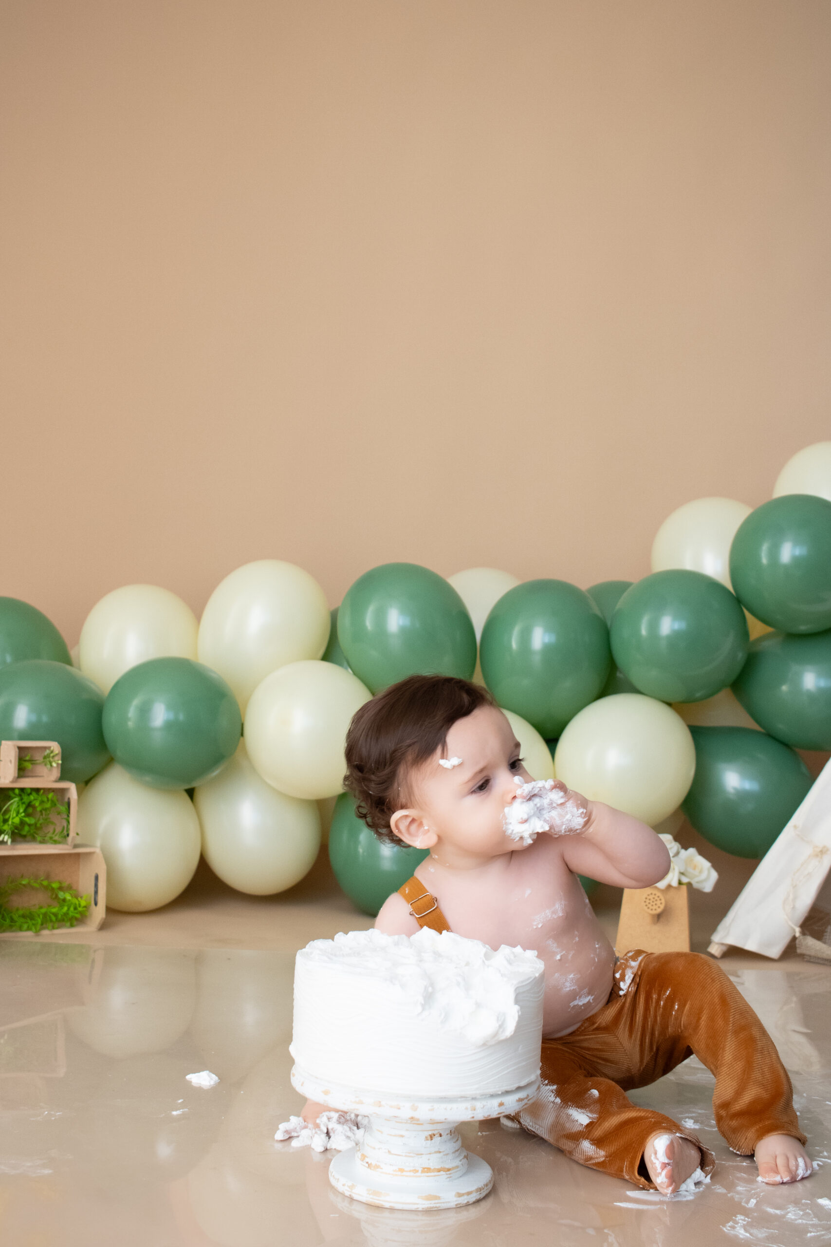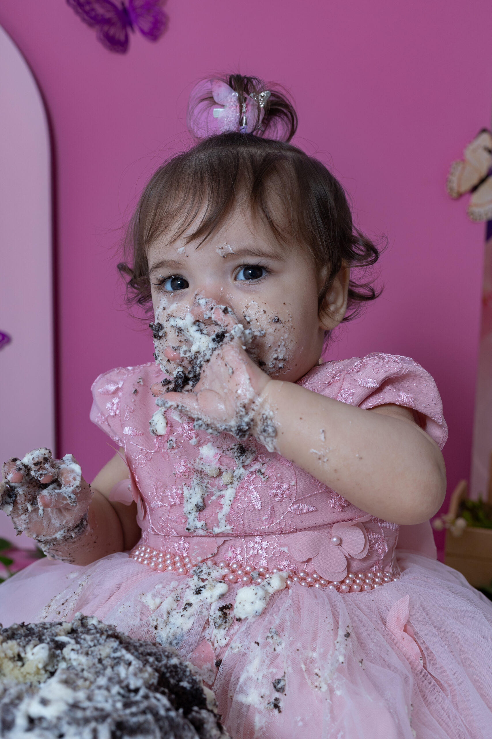 O nome smash the cake, significa ‘’ amassar o bolo’’. Primeiro de tudo tiramos fotos do cenário somente com a decoração, depois colocamos o bebê no centro e apresentamos a ele o bolo para finalmente ele brincar ou até comer o bolo.